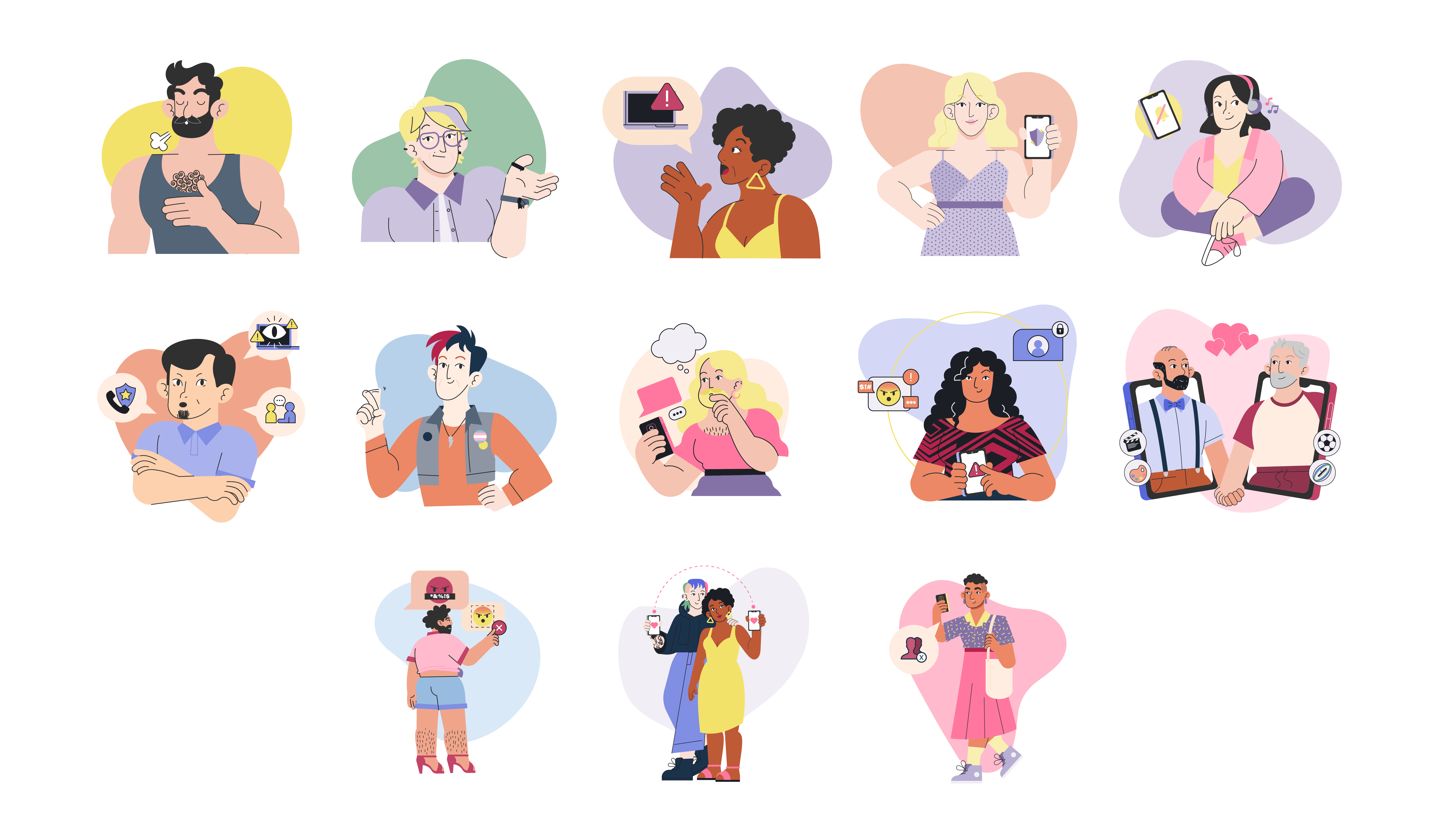 The project began with the development of thirteen original character illustrations, each based on real people and their testimonies of challenging experiences online. These stories informed both the visual design and the narrative direction of the campaign assets.